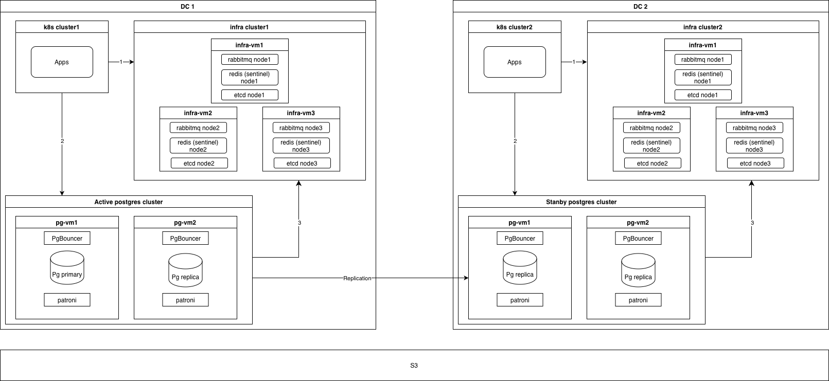 Сервисы TeamStorm подключаются к Redis, Rabbitmq, PostgreSQL (через PgBouncer). (1)(2) PgBouncer и patroni хостятся на каждой ноде postgresql. Patroni подключается в кластеру etcd (3) PostgreSQL работает в режиме StandBy Cluster c Manual Switchover. Это значит, что данные реплицируются во второй DC, но в случае сбоя возможно только ручное переключение.