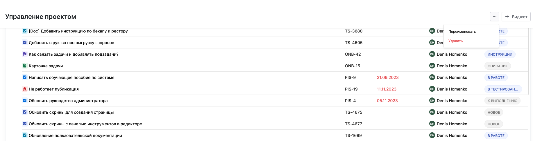 Удаление виджета из дашборда