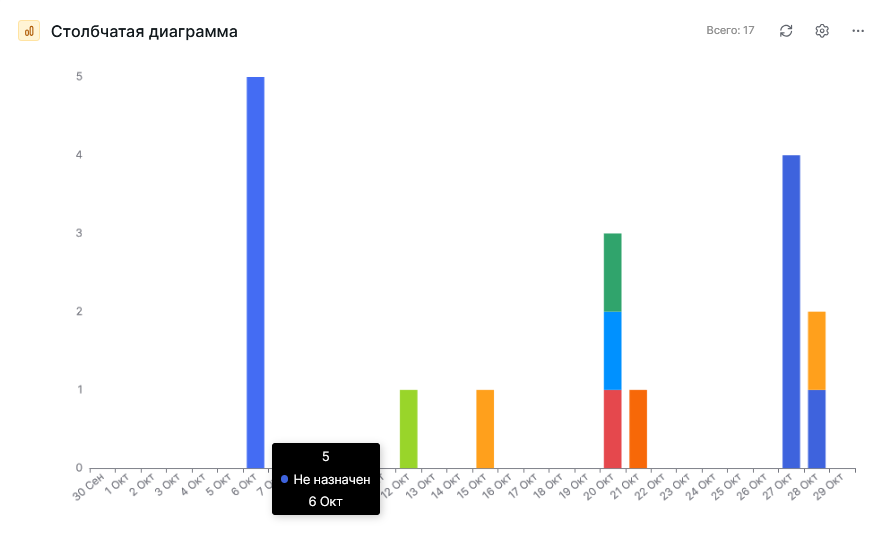 Столбчатая диаграмма, сформированная по параметру Количество задач с распределением по дате начала, за период равный прошедшим тридцати дням с временным шагом один день и группировкой по ответственному. Фокус на столбце за 6 октября. В легенде показывается количество задач, ответственный, дата начала.