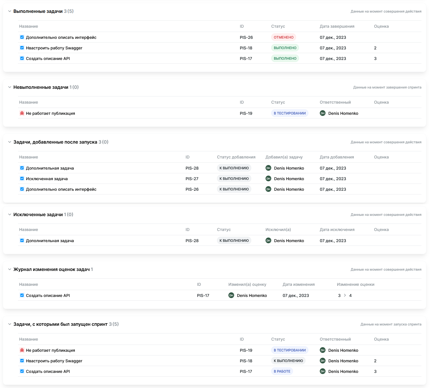 Таблица отображается после фактического запуска спринта. В отчет попадают задачи, у которых после даты старта спринта оценка менялась в большую или меньшую сторону. Данные в таблице отображаются на момент совершения действия (изменения оценки задачи).