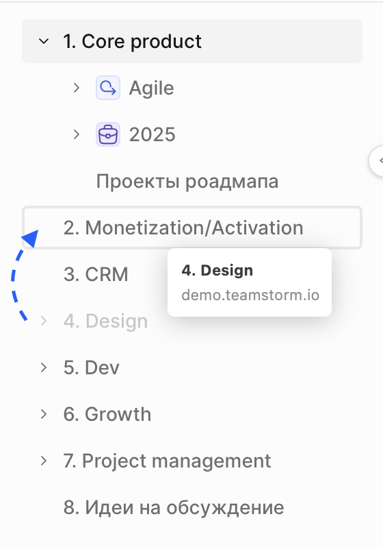 TeamStorm позволяет легко перемещать папки, перетаскивая их из одной в другую или в корень рабочего пространства.