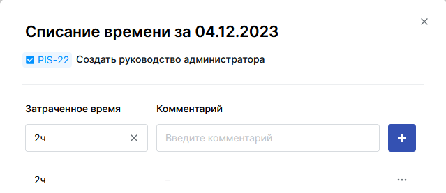 - В открывшемся окне введите количество затраченного времени в часах и комментарий к списанию (опционально).
