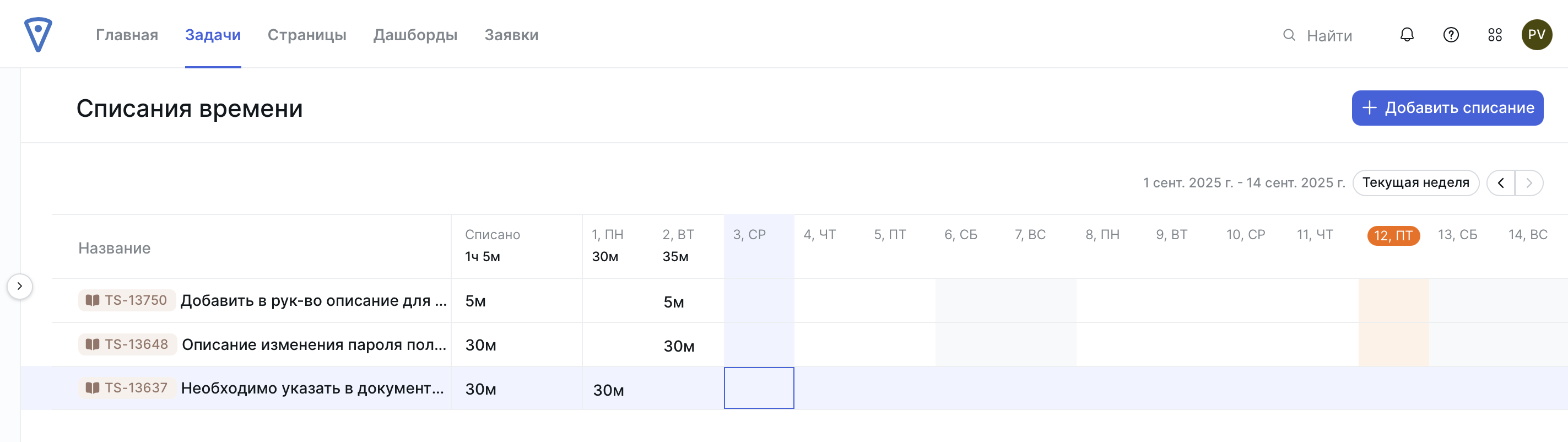Подраздел Списание времени позволяет видеть все свои списания трудозатрат в едином списке и управлять списаниями из него.
