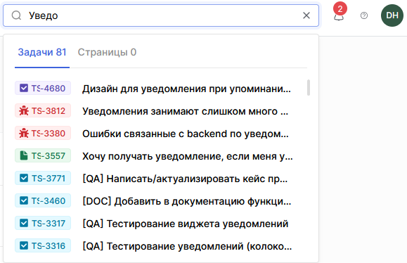 - На Главной странице начните вводить название или идентификатор задачи в поле поиска в правой верхней части экрана.