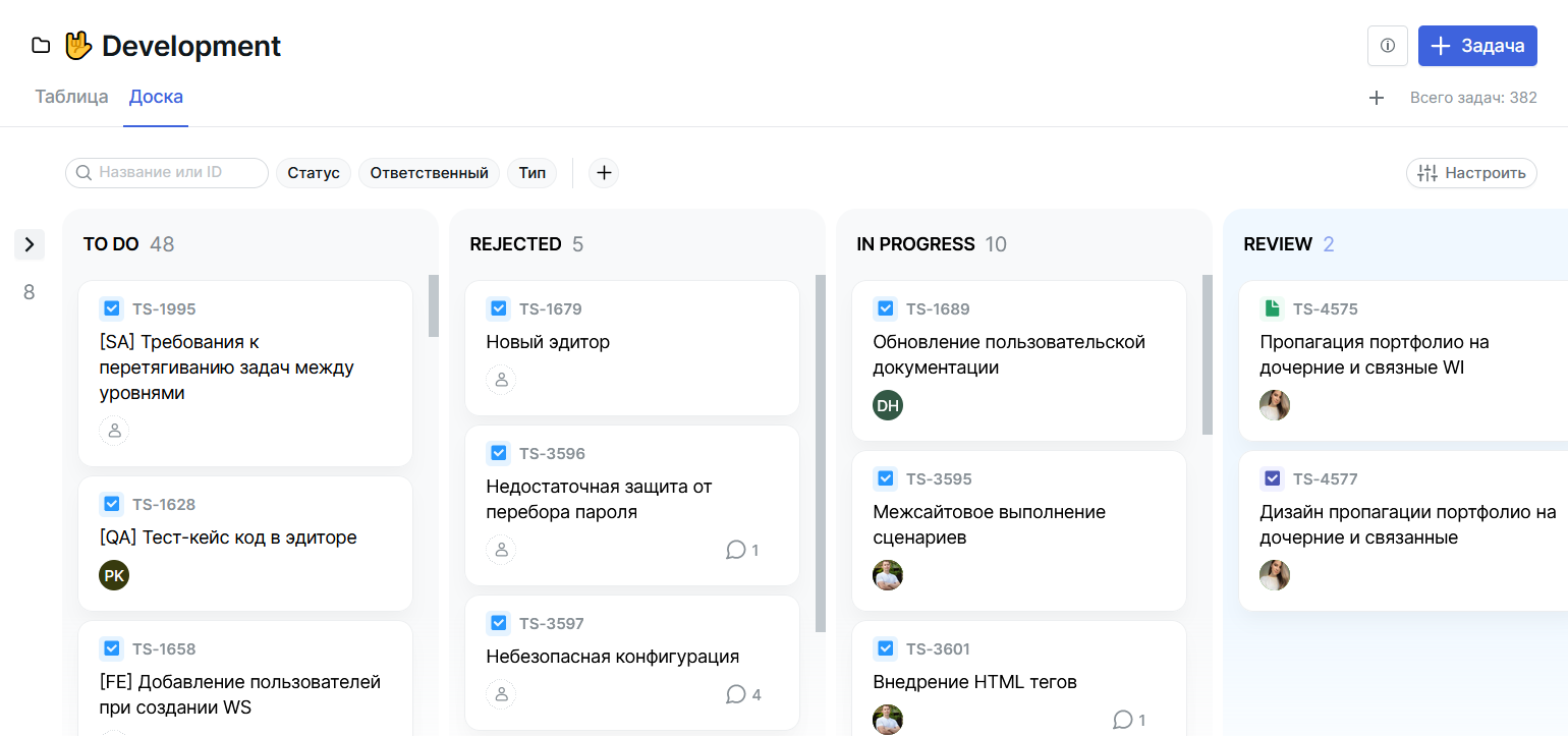 Карточки Доски могут содержать краткую информацию об ответственном, количестве комментариев к задаче, емкости задачи, датах начала и завершения задачи и т.д.