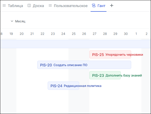 Представление Гант отображает в графическом виде то, как выполняется запланированная работа с течением времени.