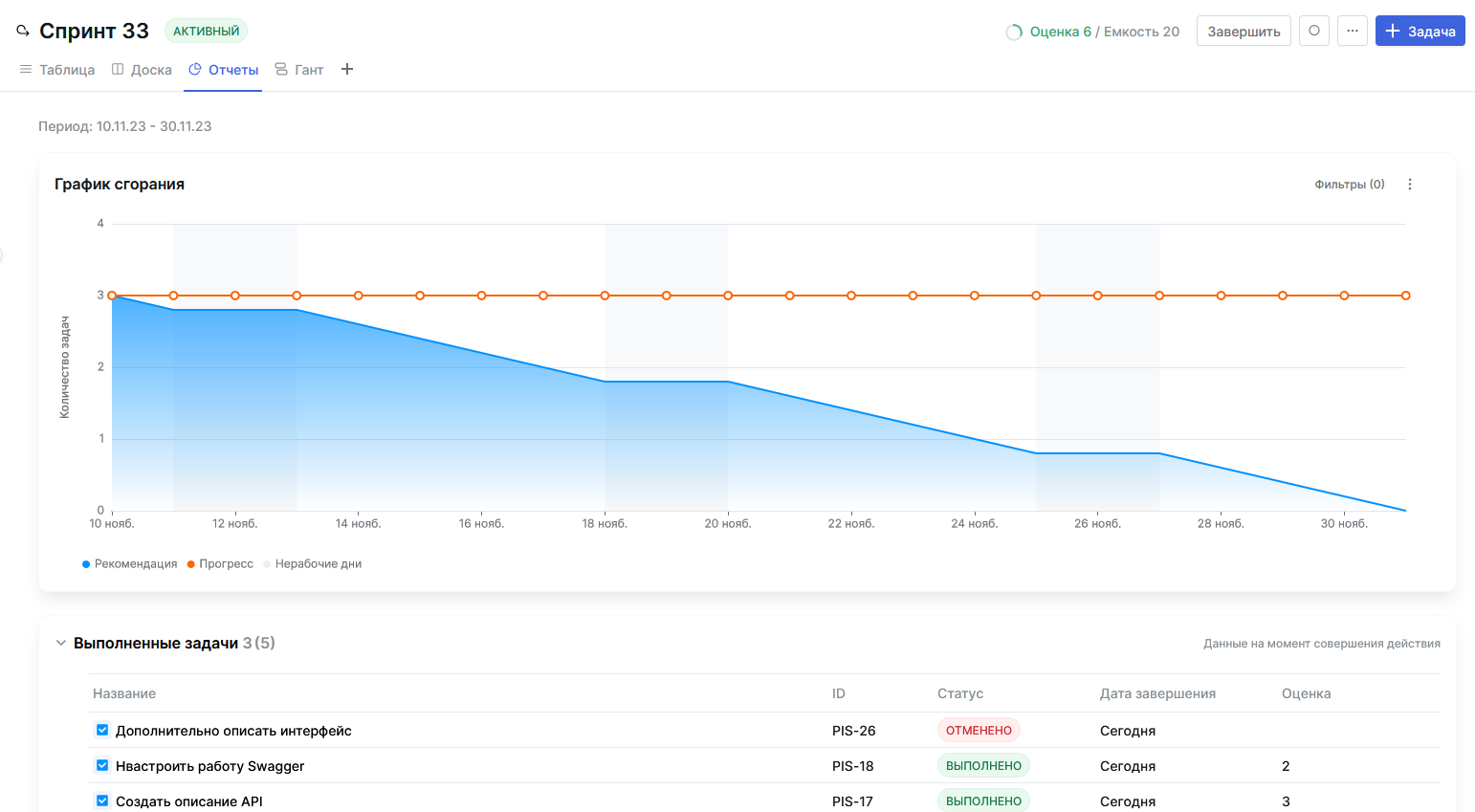Для спринтов и портфелей в системе доступно представление Отчеты.