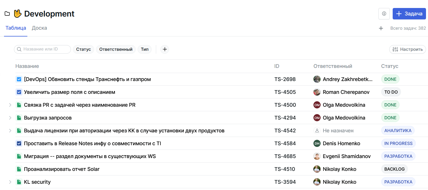 Представления отображают задачи выбранной папки или списка задач. В представлениях доступны фильтрация и поиск отображаемых задач по названию, статусу, типу и ответственному за задачу.