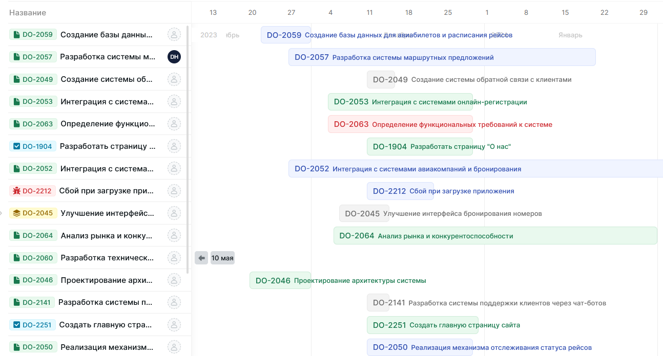 Цвет плашки на диаграмме соответствует цвету статуса каждой задачи. Задачи на диаграмме сортируются по дате изменения, более новые задачи располагаются сверху.