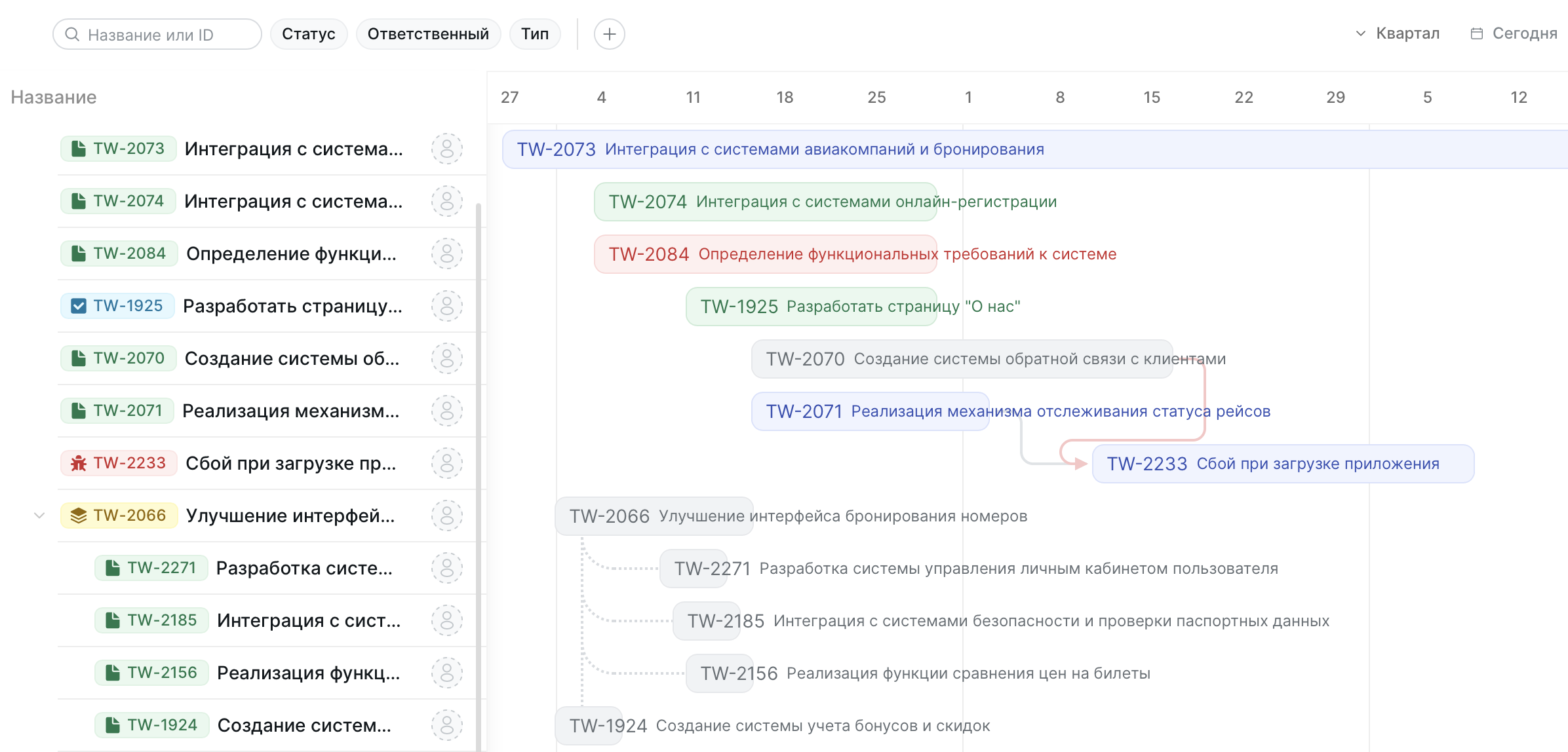 Блокирующие связи между задачами показываются сплошной серой линией со стрелкой на конце. Стрелка указывает на блокируемую задачу. Если дата начала блокируемой задачи раньше даты окончания блокирующей, линия станет красной. При наведении на нее появится соответствующее предупреждение.