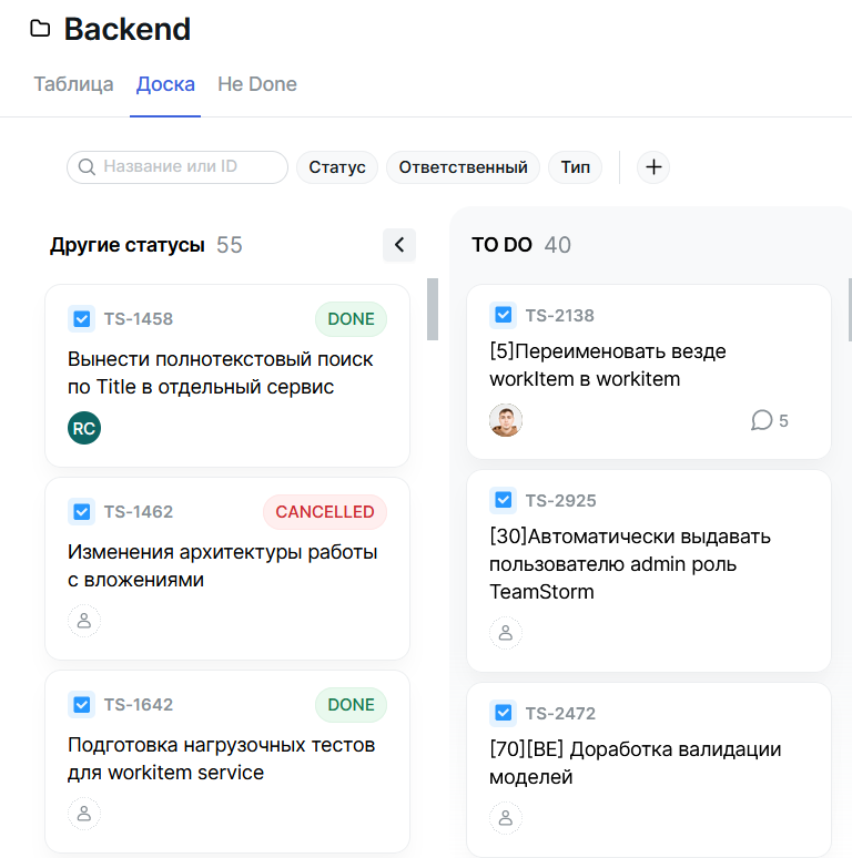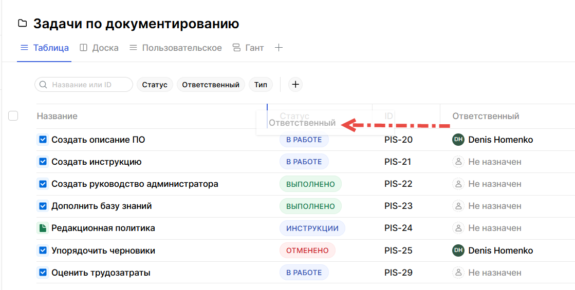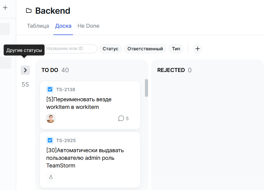 При нажатии на Другие статусы будет отображена колонка, содержащая задачи со всеми скрытыми статусами.