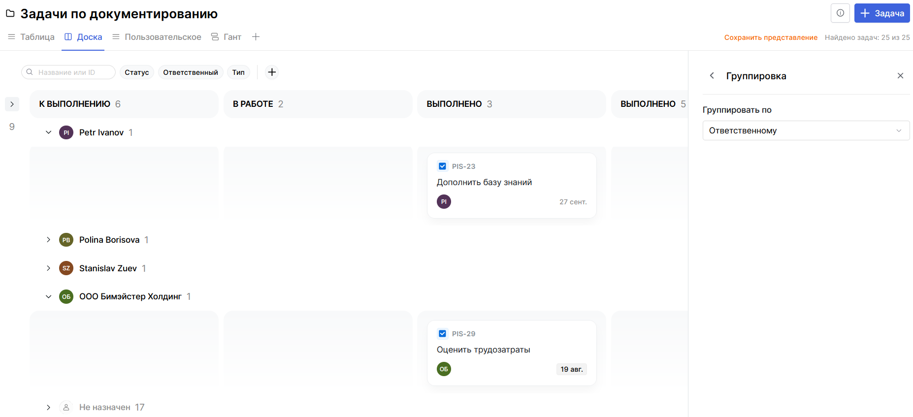 Группировка задач на доске позволяет визуально разделять задачи по разным параметрам.