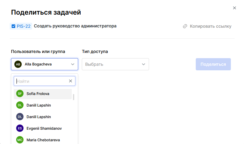Поделиться задачей. - В открывшемся окне выберите при помощи выбора из списков пользователя или группу, с которыми вы хотите поделиться задачей, и тип предоставляемого доступа.