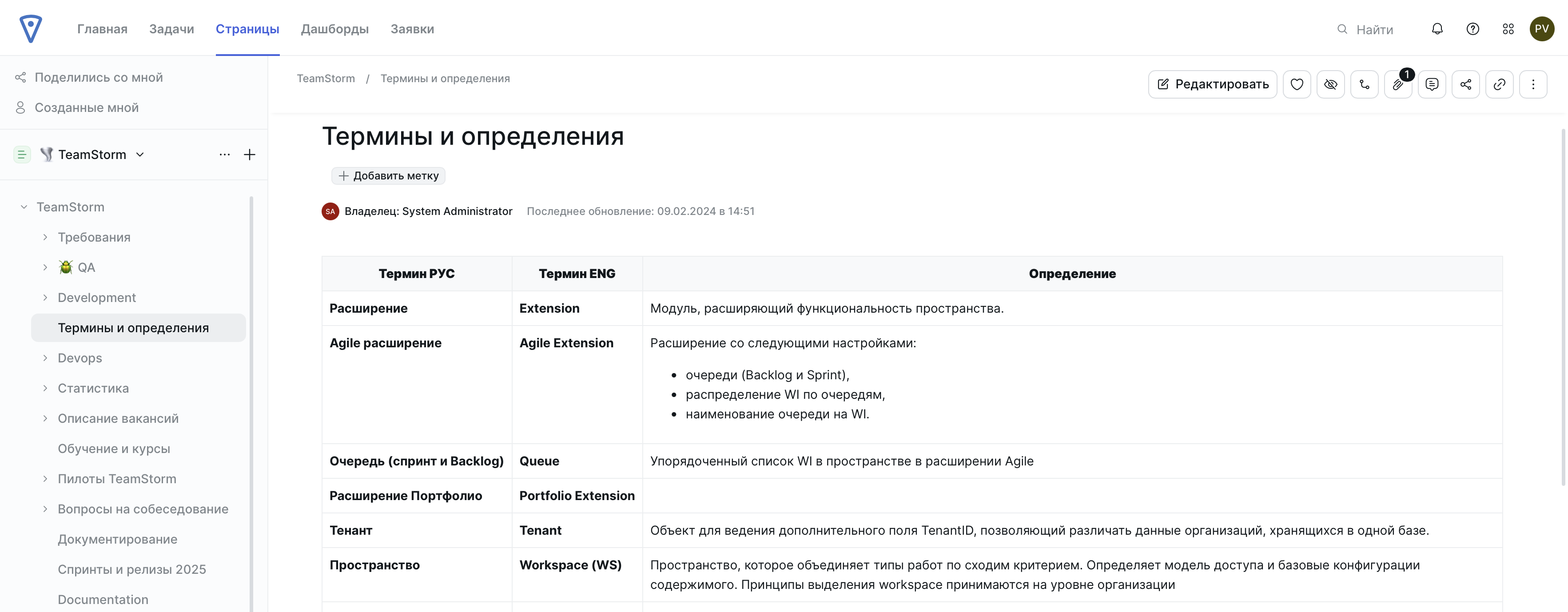 Раздел «Страницы» — это интегрированная в TeamStorm система управления знаниями для распределенных команд.