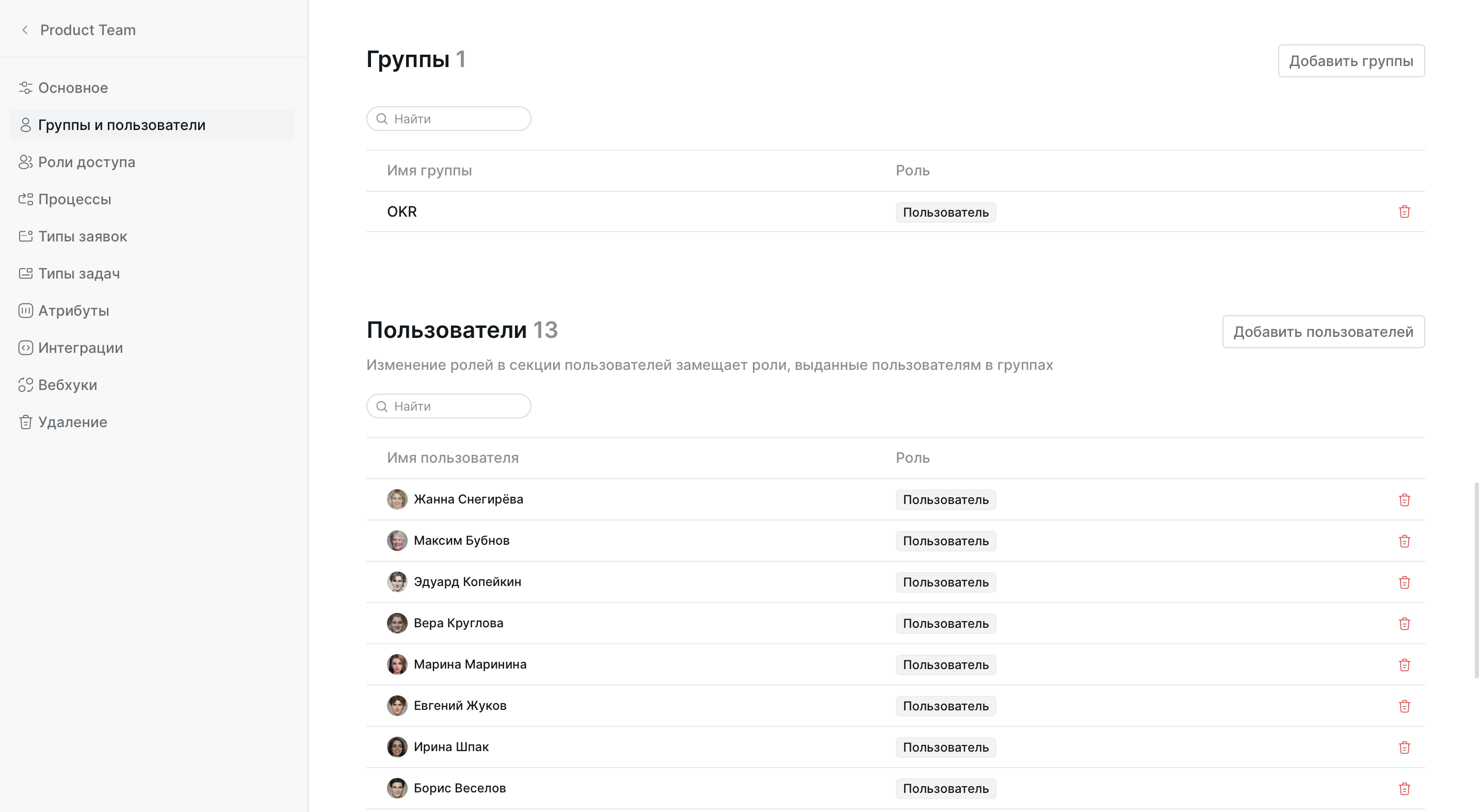 - На левой панели экрана настроек пространства нажмите Группы и пользователи.